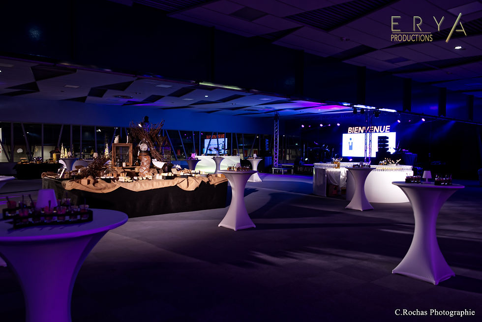 Un Photobooth (borne à Selfie) aux couleurs de votre soirée, des mange-debout lumineux, bars lumineux, tapis rouge et potelets or pour honorer l'entrée des invités, canapés chesterfield gonflables, lampes FatBoy sur vos tables, etc...